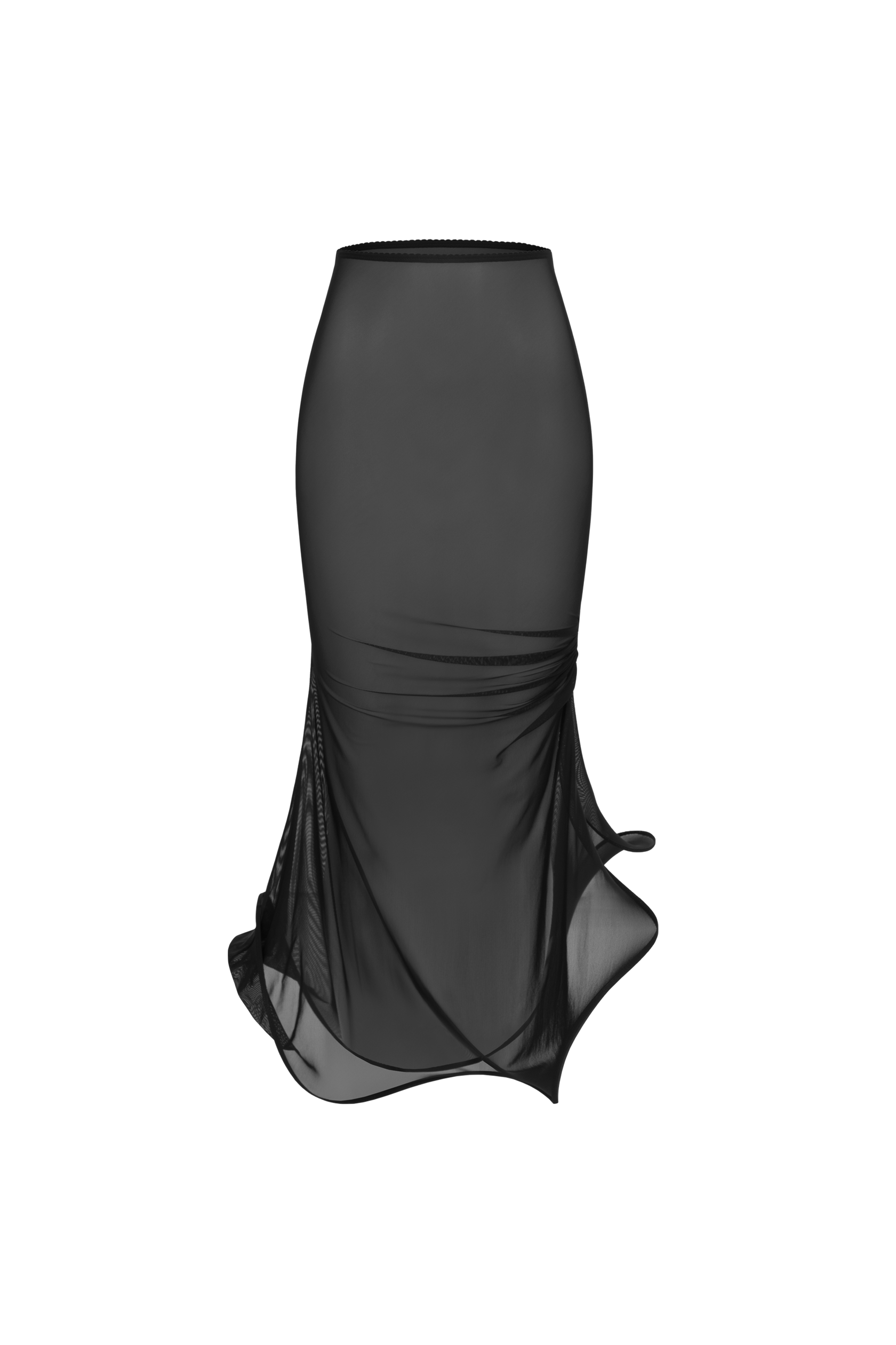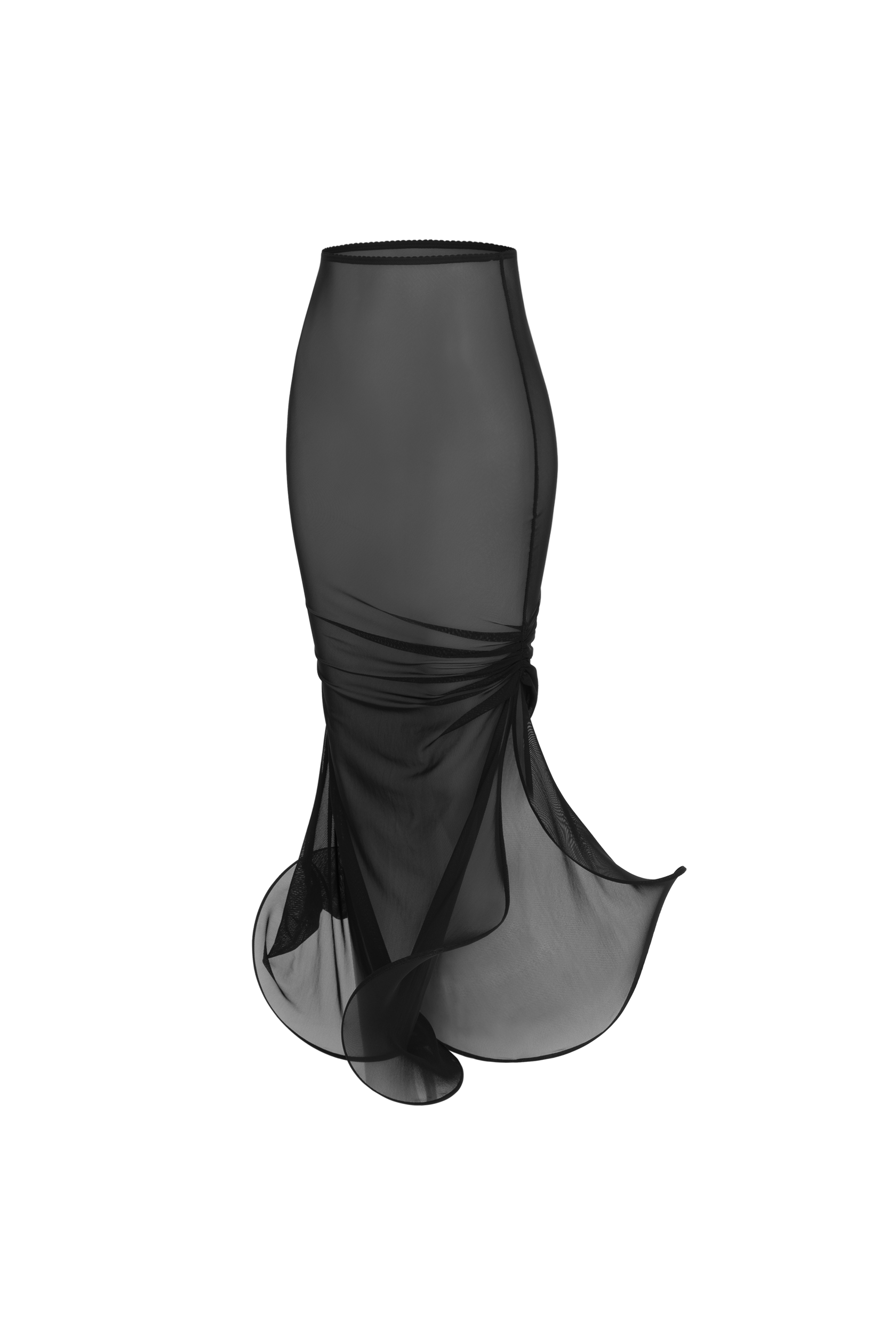 A maxi skirt made of transparent mesh with a high slit, finished with a rigid trim along the hem, moves smoothly with every movement, creating a sense of fluidity and elegance.
